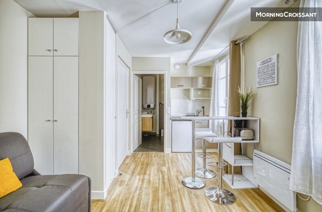 With a surface area of 16 m2, it unveils a modern space to make you feel at home. A sofa convertible into a bed, a modern living room with storage cupboards, American kitchen, bar, everything has been thought for your comfort for a stay in Paris, even the presence of a small washing machine to make your stay more pleasant. The presence of TV and wifi internet will allow you to plan your appointments in the capital with ease. A modern shower room completes this contemporary property.