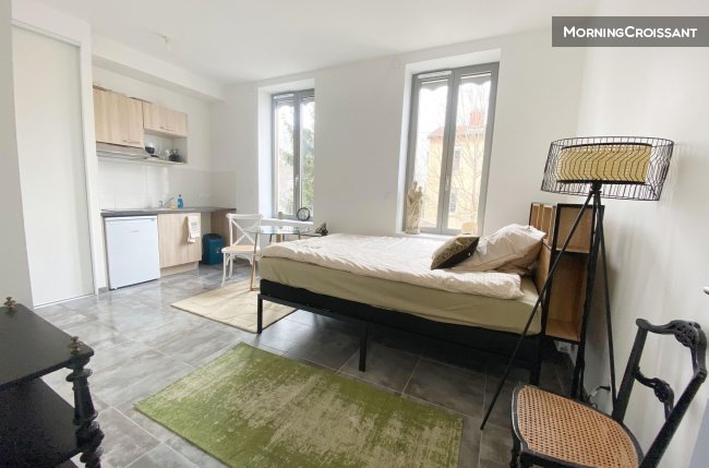 Bright studio flat, kitchen opening onto living room, bathroom, separate toilet, tastefully furnished, equipped and pleasant, first occupation